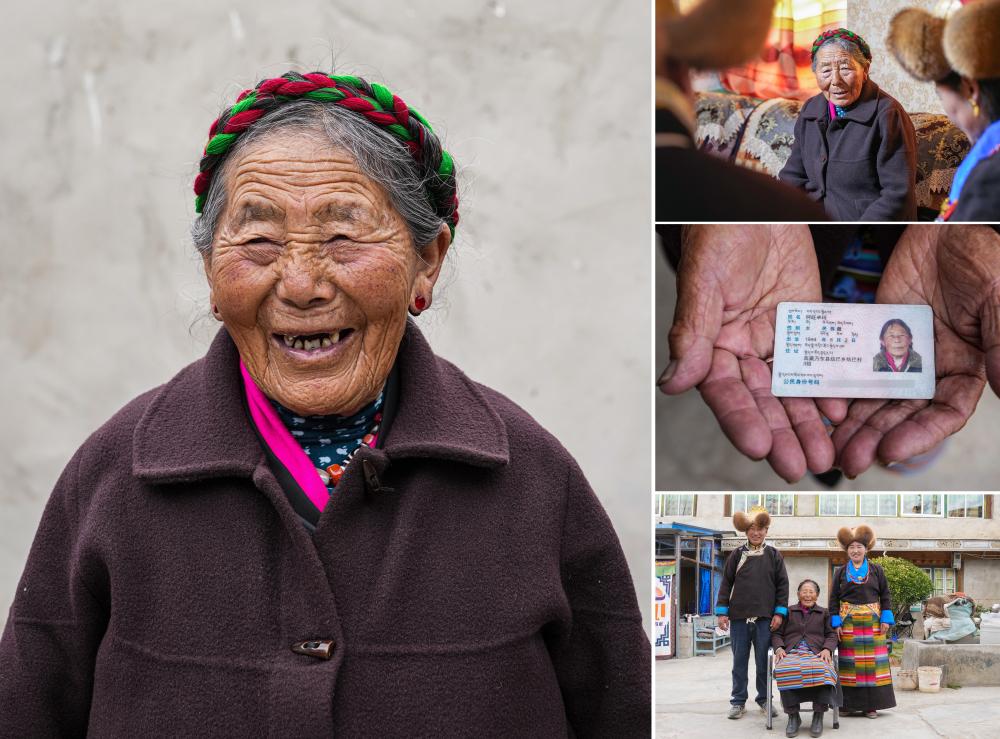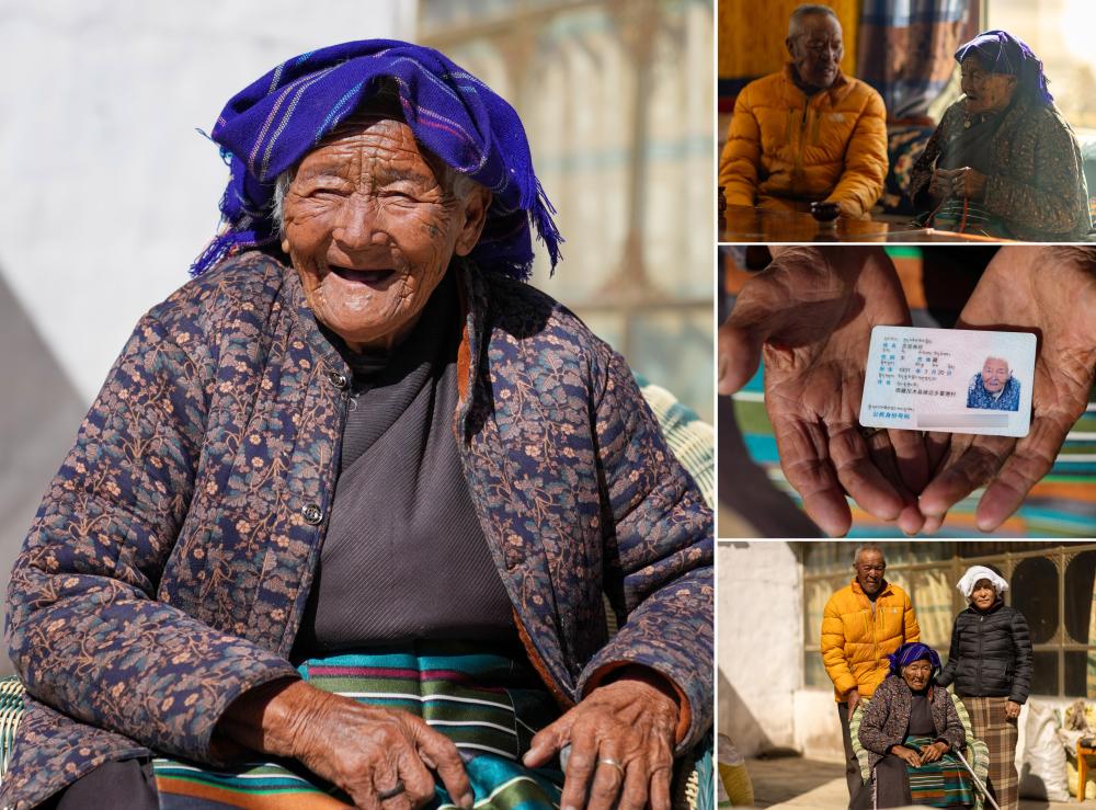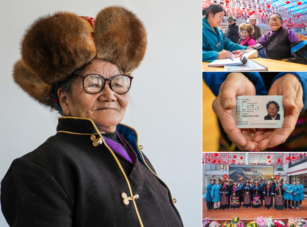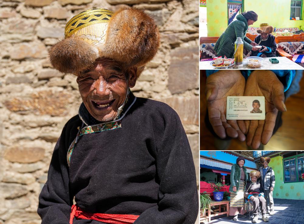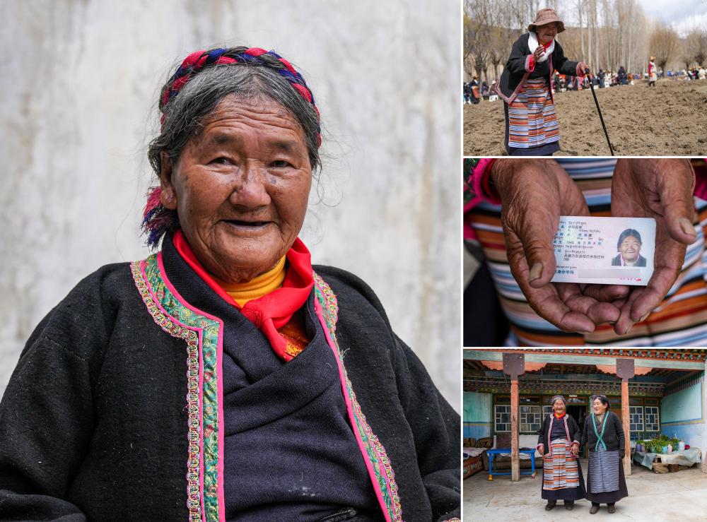 拼版照片:(左)次德吉的肖像(3月25日摄);(右上)次德吉在山南市桑日县特困人员集中供养中心测量血压(3月25日摄);(右中)次德吉的身份证(3月25日摄);(右下)次德吉(前排右七)和部分山南市桑日县特困人员集中供养中心老人合影(3月25日摄)。