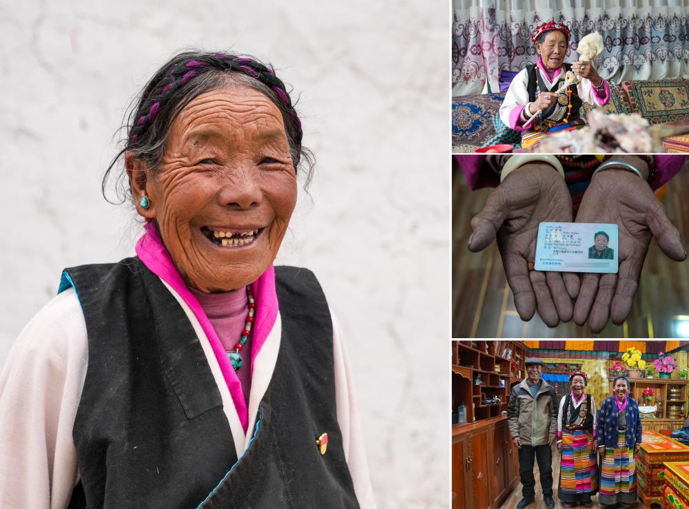 拼版照片:(左)卓玛吾珠的肖像(3月16日摄);(右上)卓玛吾珠在庆祝春耕仪式上(3月16日摄);(右中)卓玛吾珠的身份证(3月16日摄);(右下)卓玛吾珠(左)和女儿在家中的合影(3月16日摄)。