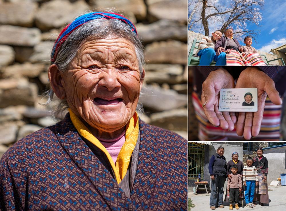 拼版照片:(左)次仁桑姆的肖像(3月26日摄);(右上)次仁桑姆(中)和两位晚辈在宗卡村家中的院子里聊天(3月26日摄);(右中)次仁桑姆的身份证(3月26日摄);(右下)次仁桑姆(后左2)和家人在宗卡村家中合影(3月26日摄)。
