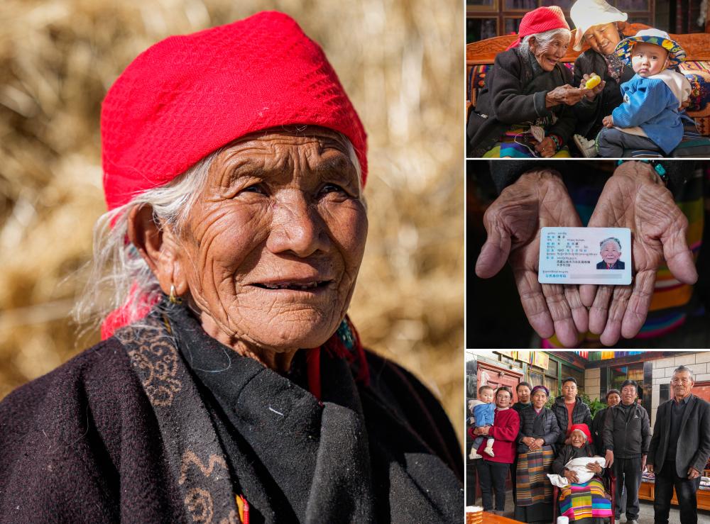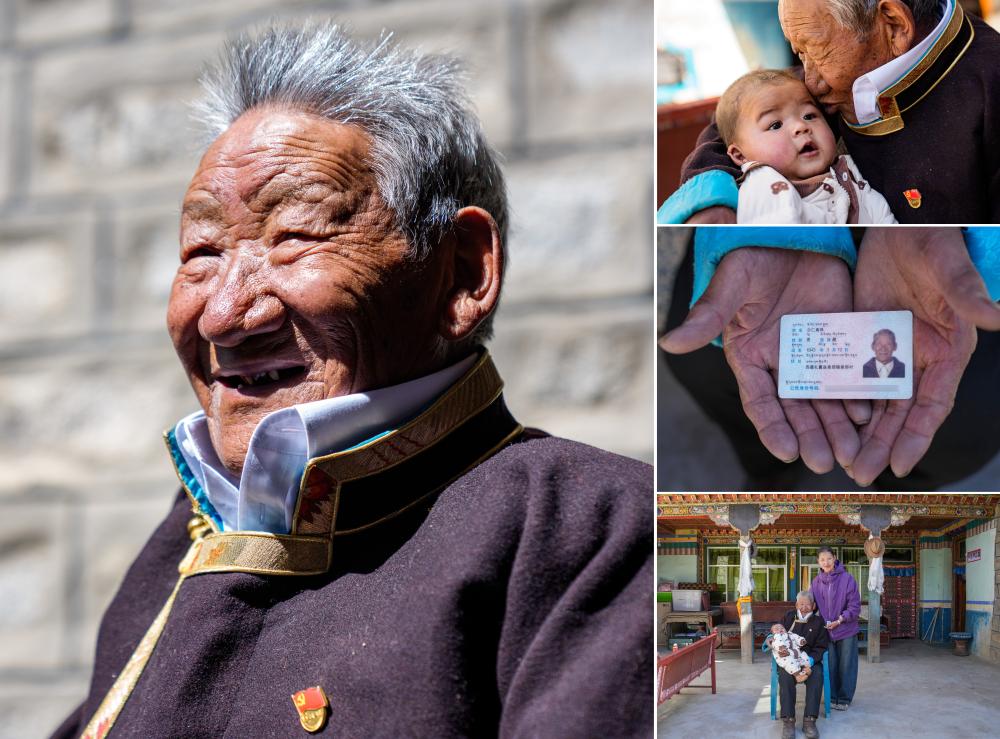 拼版照片:(左)次仁桑珠的肖像(3月25日摄);(右上)次仁桑珠在西藏山南市扎囊县桑耶镇的家中亲吻曾孙(3月25日摄);(右中)次仁桑珠的身份证(3月25日摄);(右下)次仁桑珠(中)和孙女、曾孙在西藏山南市扎囊县桑耶镇家中的合影(3月25日摄)。