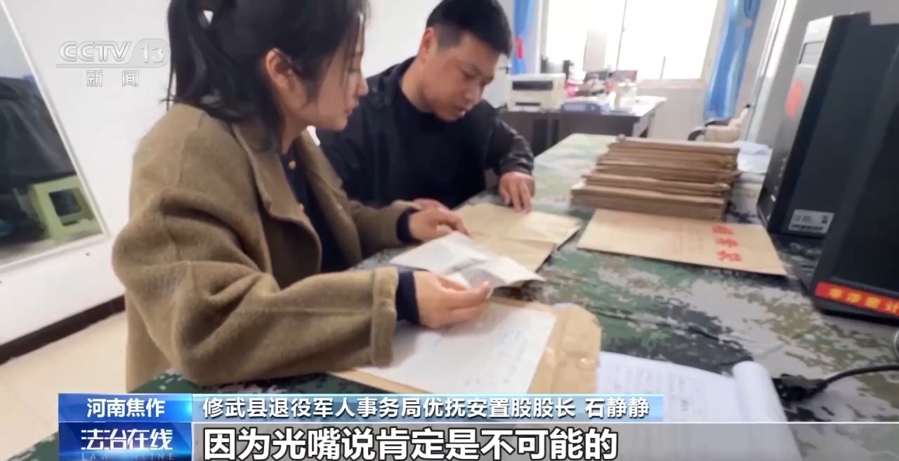 修武县退役军人事务局优抚安置股股长石静静:这边我先把他资料简单看看,然后再往上面反映一下,看看能不能找到有啥依据,因为光嘴说肯定是不可能的。