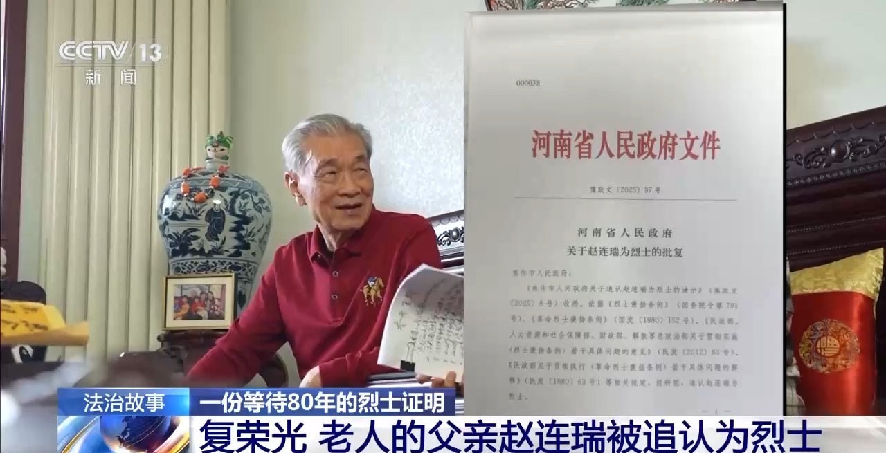 2025年9月4日,对于赵全玺来说,是一个特殊的日子,这一天,他的父亲赵连瑞,被河南省人民政府正式追认为烈士。自1945年父亲牺牲至今,已经过去了80年。