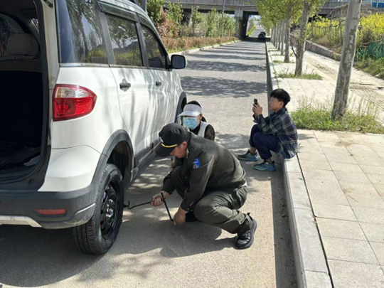 巡防队员立刻上前了解情况,女子称自己姓王,趁着清明假期天气好,便带孩子们出来踏青游玩,车子行驶到该地时,车胎突然爆胎,附近也没修车的地方,一时犯了难。得知情况后,队员们一边安抚女子情绪,一边分工协作展开救援:先在车后摆放警示标志,保障路面通行安全,再熟练取出备胎和维修工具,快速完成顶车、拆旧胎、装备胎、紧螺栓等操作,短短十余分钟就换好备胎,让车辆恢复行驶条件。