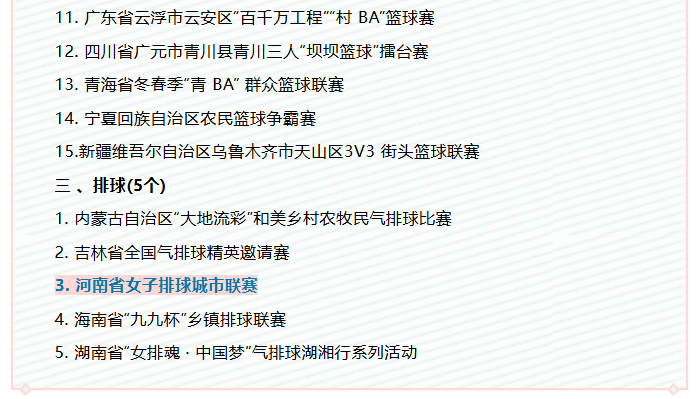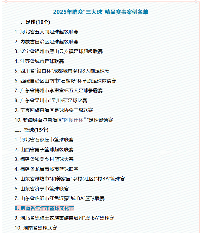 据了解,为进一步服务“三大球”振兴,推动群众“三大球”赛事繁荣发展,发挥精品赛事示范引领作用,2025年11月,国家体育总局办公厅印发《关于开展2025年群众“三大球”精品赛事案例推荐工作的通知》。经申报审核、背景审查、评审推荐、社会公示等环节,推选出2025年群众“三大球”精品赛事案例共30个并予以公布。其中,足球10个,篮球15个,排球5个。