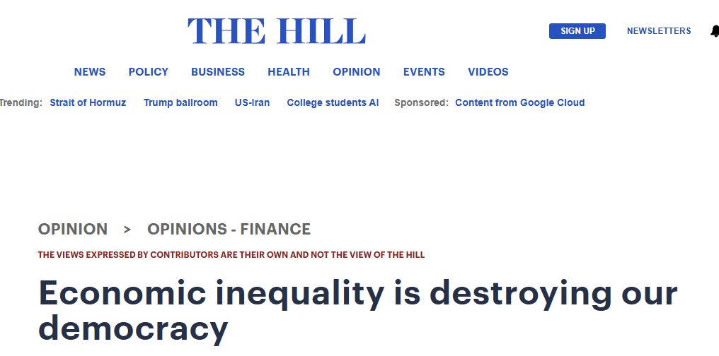 美国《国会山报》 4月12日刊发题为《经济不平等正在撕裂美国民主》的评论文章,以大量实证数据揭示了美国社会日益加剧的财富分化现象。