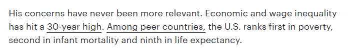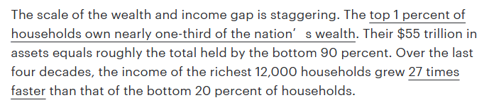 文章总结说,财富滋生政治影响力,政治影响力又进一步聚敛财富。其结果就是,美国已不再是机遇之地。美国社会流动性排名全球第27位,落后于多数发达国家。