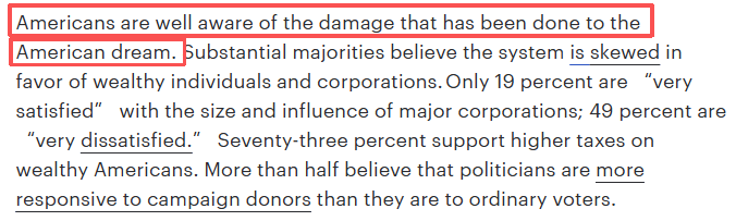 文章说,美国人对“美国梦”的破碎心知肚明:绝大多数人认为制度偏向富人与大企业。持续深化且不断扩大的不平等正在瓦解社会凝聚力,催生对制度的不信任,并扭曲国家发展重心。