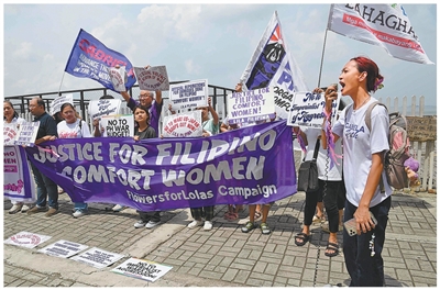 菲律宾民众在首都马尼拉一尊“慰安妇”雕像旧址附近举行二战结束80年纪念活动。