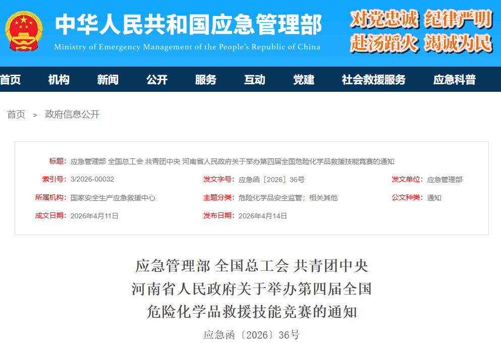 应急管理部、全国总工会、共青团中央、河南省人民政府定于2026年10月中旬在河南省濮阳市共同举办第四届全国危险化学品救援技能竞赛(以下简称竞赛)。现将有关事项通知如下: