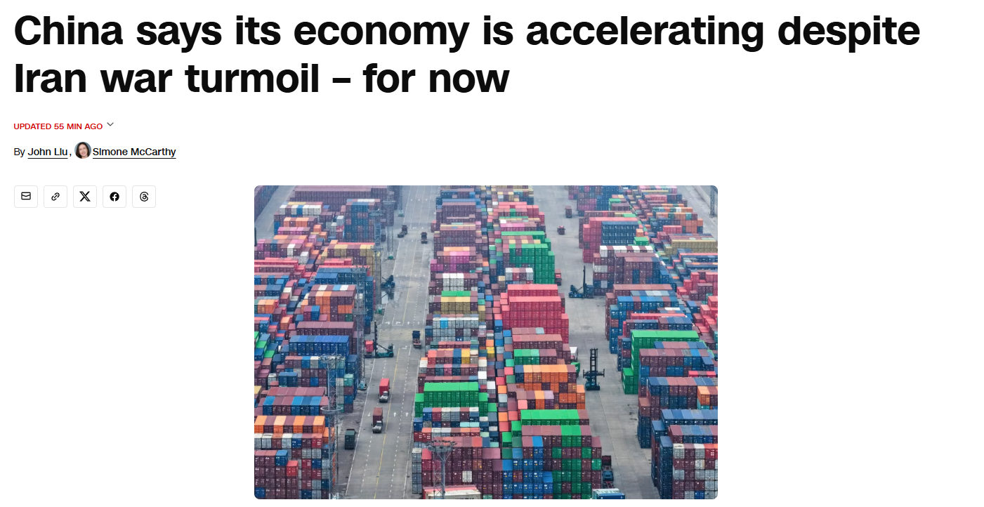 报道同时注意到,3月份中国工业增加值同比增长5.7%,强于市场预期,电子设备、汽车、半导体和机器人等产品的外部需求依然较强,出口仍将是今年推动中国经济的重要力量。