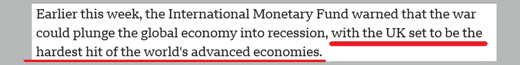文章援引本周早些时候国际货币基金组织的警告称,美以伊冲突可能使全球经济陷入衰退,而英国将成为发达经济体中受冲击最大的国家。