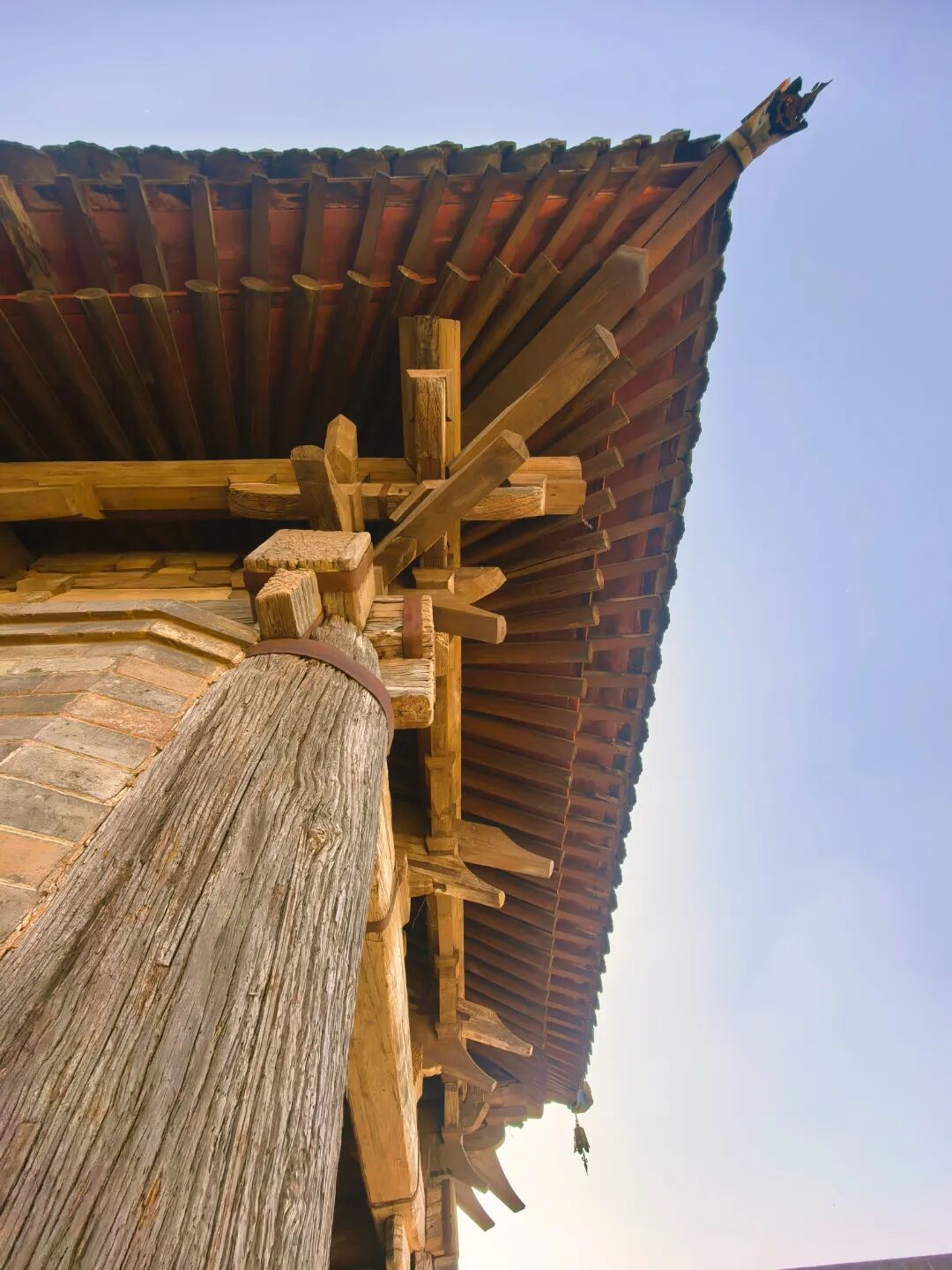 舞楼最独特的是戏台顶部的八卦藻井,没有一根大梁椽木,天井勾栏交榫不用一铆一钉,其细木交连,层层向上,构成穹顶。屋顶鸱吻为元代构件,琉璃瓦品为孔雀蓝色,十分珍贵。