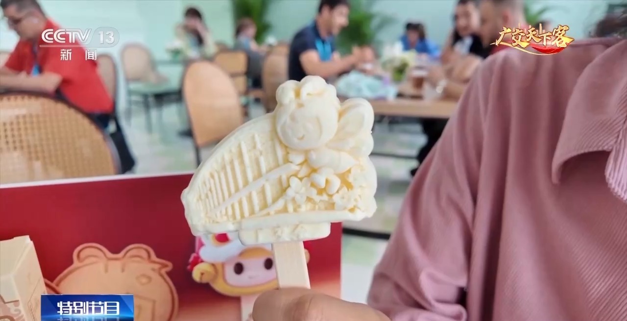 总台记者朱解语:新品文创雪糕造型采用的是广交会展馆的元素,结合了好宝、好妮的萌趣形象,还点缀了广东特色的木棉花。逛展累了来一口,真是清甜又解暑。新品文创巧克力,它不仅和我们的吉祥物造型相融合,还创造性地运用了广东醒狮的元素。