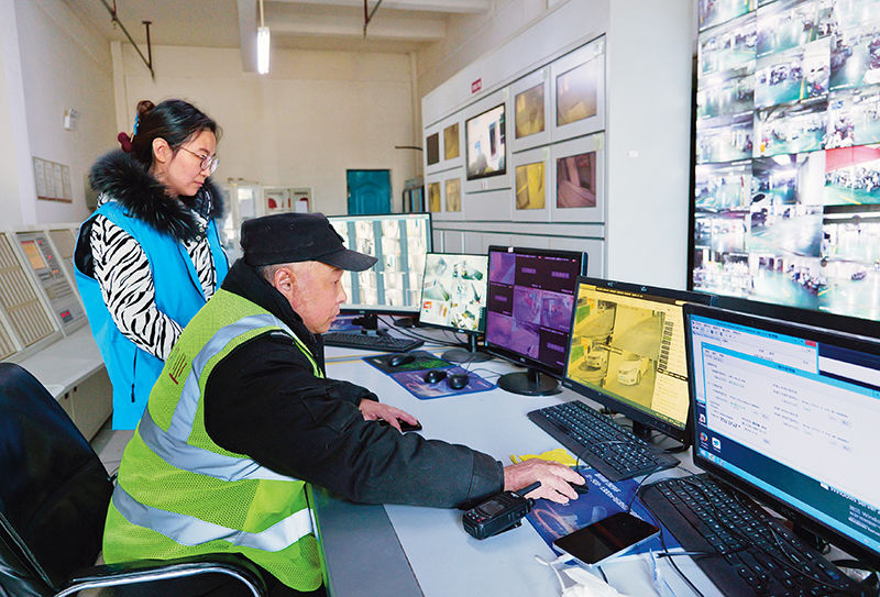 在郑州市秦江花园小区,秦岭路街道秦江社区的网格长(左)在查看小区安防监控(2024 年 11 月 28 日摄) 李嘉南摄 / 本刊