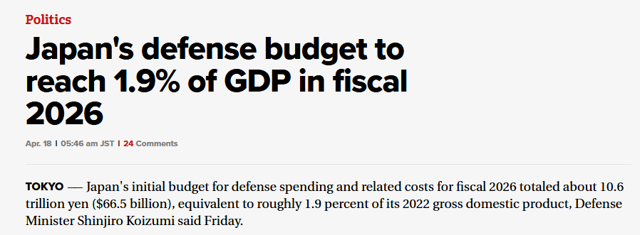 上周,日本防卫大臣小泉进次郎还进一步宣称,2026财年,日本全部国防开支及相关费用的初步预算总额,将达到约10.6万亿日元。