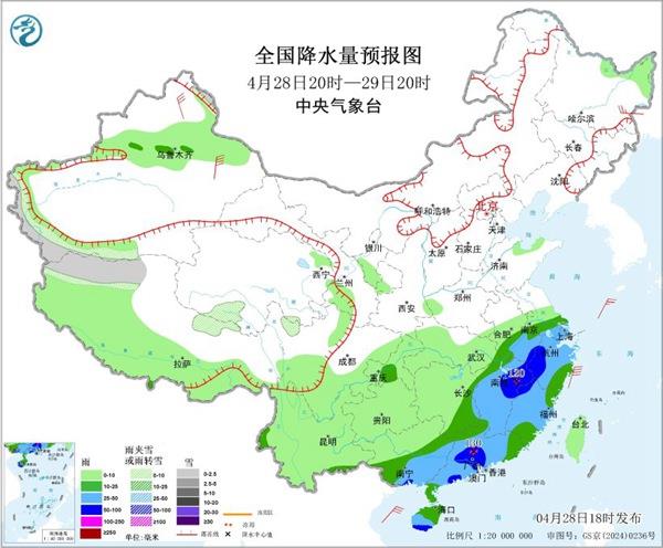 明天(29日)开始,随着偏北气流南下,暖湿气流南退,南方降水将收缩、减弱,暴雨、大暴雨基本“下线”。上海、浙江、福建、广东以中到大雨为主,其中福建东部、广东东部有大雨,局地暴雨。
